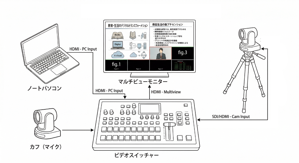 最新のリモートコントロールカメラと音響映像オールインワンミキサーにより、 スタッフ1名でプロ品質のオンライン配信・録画を実現します。